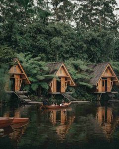 Perpaduan pohon hijau, danau, dan rumah bambu khas Sunda, menjadi daya tarik yang menarik di wisata ini. Selain untuk bersantai dan menikmati suasana yang syahdu, traveler pun bisa staycation di penginapan ataupun dengan cara berkemah.