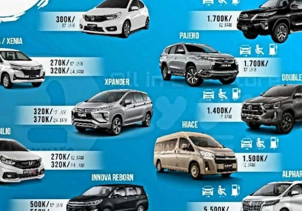 Daftar Harga Tujuan Bandung – Lembang – Ciwidey – Pangalengan Harga Sudah Termasuk Mobil Driver BBM Toll Harga Belum Termasuk Parkir Makan Driver / Uang Makan Note Durasi 12 Jam Jumlah Seat Sudah Termasuk Driver Khusus tujuan Ciwidey, Pangalengan, dan D’Castello Ciater ada penambahan biaya sebesar 100rb Calya 6 Seat Rp. 600.000 Grand Avanza 7